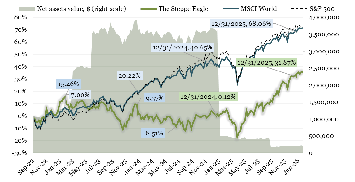 The Steppe Eagle finished 2025 with a gain of +31.71%, whereas the benchmark, MSCI World Index, yielded +19.49%. Since its inception, the Steppe Eagle has arrived at +31.87% versus +68.06% for its benchmark. Since September 2022, inflation in the US (CPI) has accumulated to 10.02%.Thus, the Steppe Eagle soared above its benchmark by 12.22% in 2025 but is still 36.19% below it since the Fund’s inception.