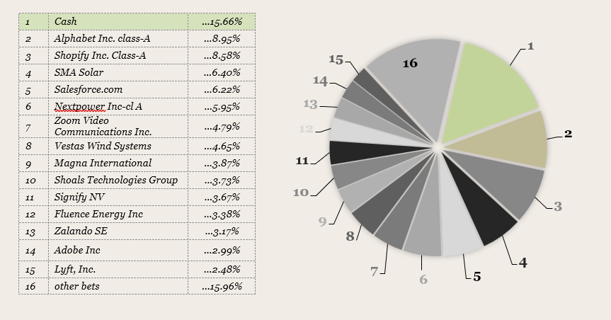 The Fund’s recovery stood on two whales: the end of the bear market in the clean energy sector, hopefully, and the strong performance of a few IT bets we had for several years, like Alphabet and Shopify. We can’t see the future, but we see that the success of these stories is far from over, because we try to stick to multi-decade super trends that are shaping our world.